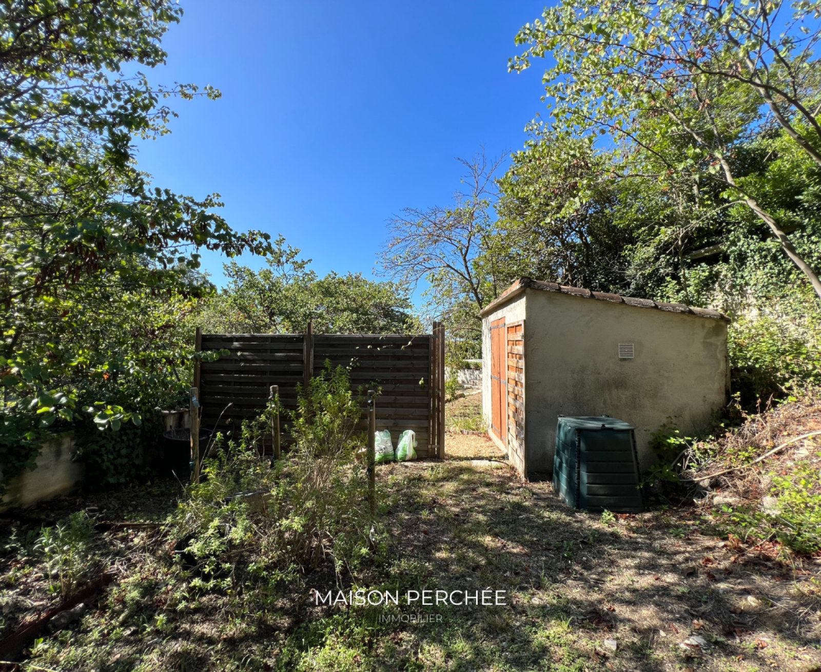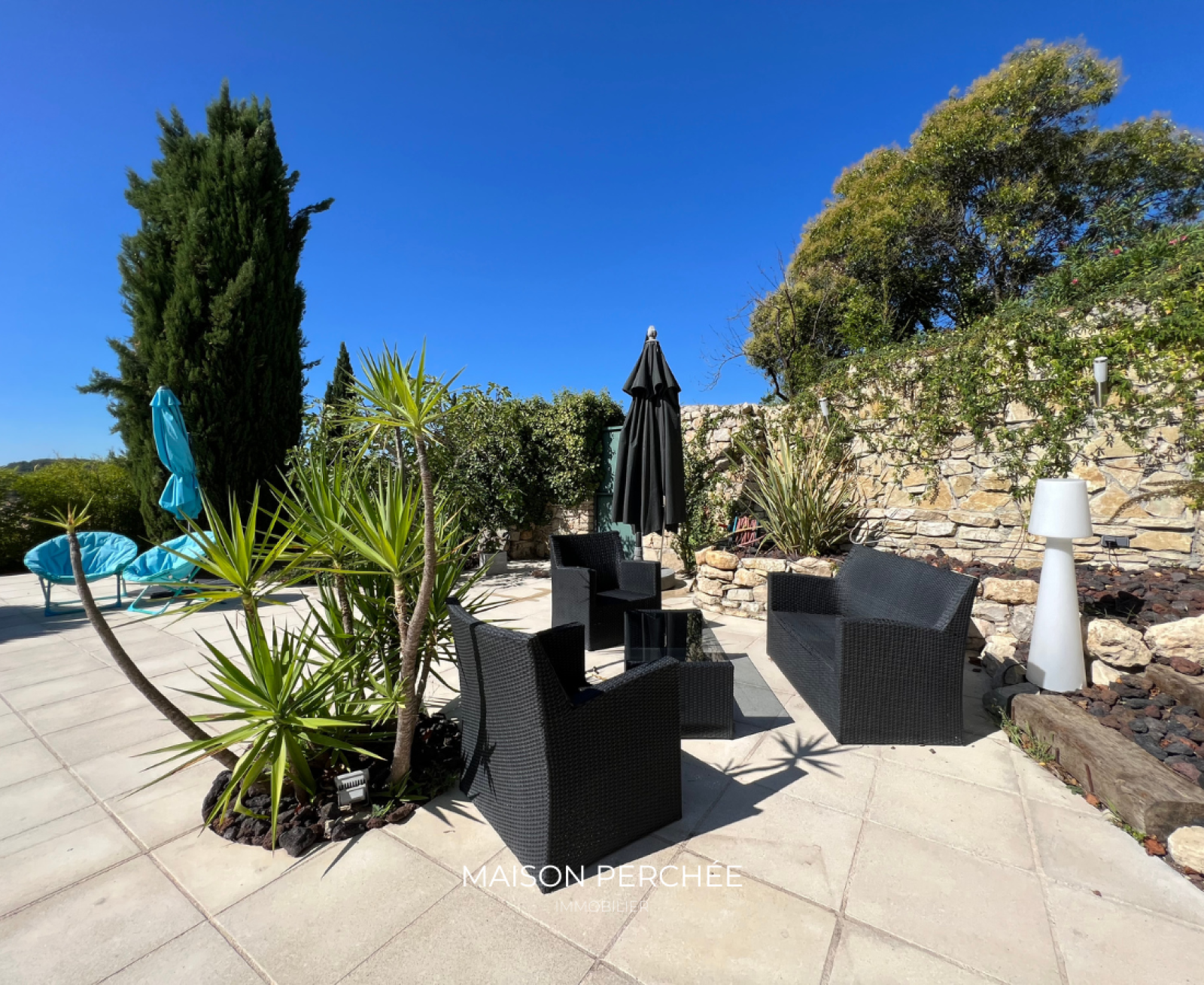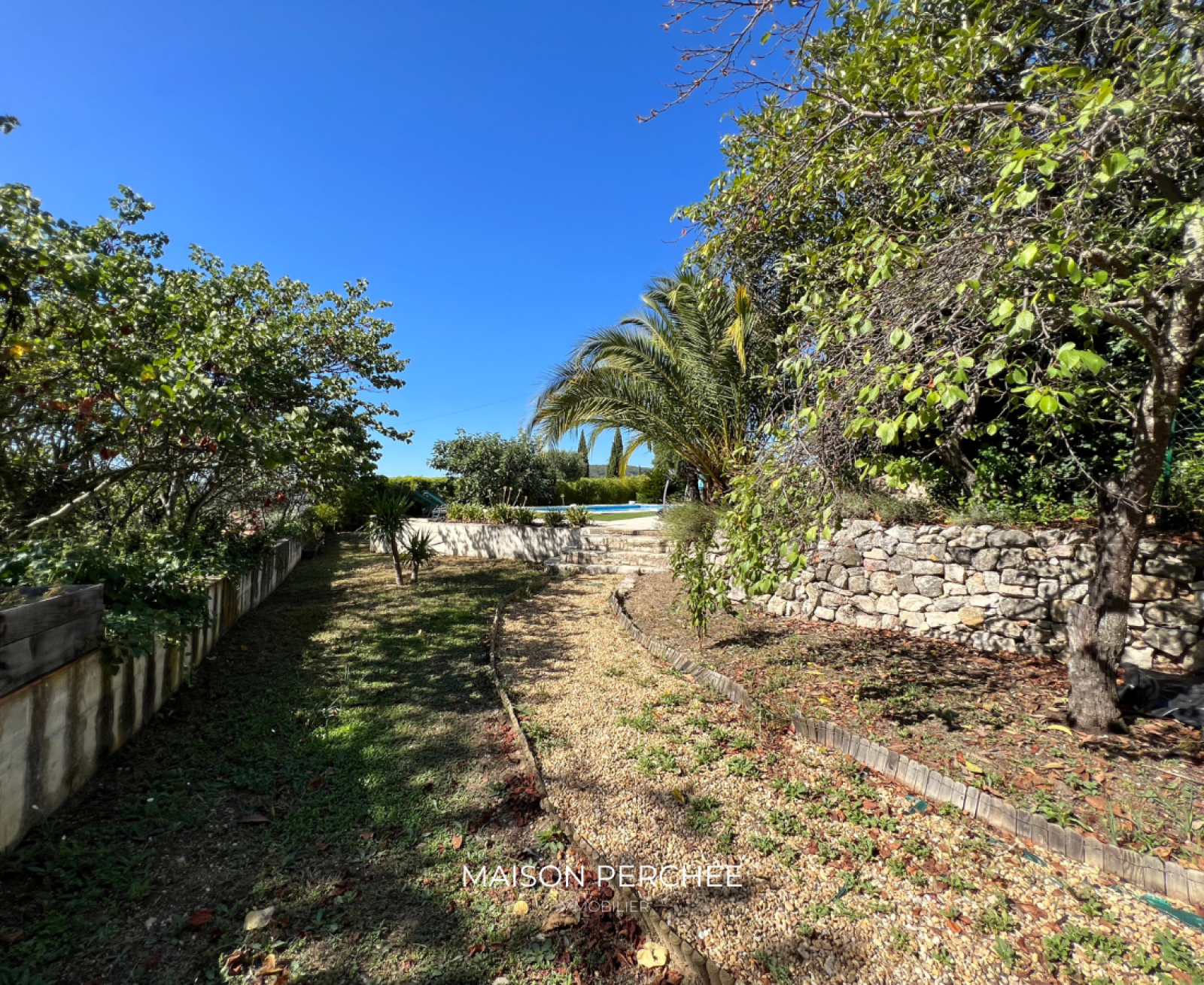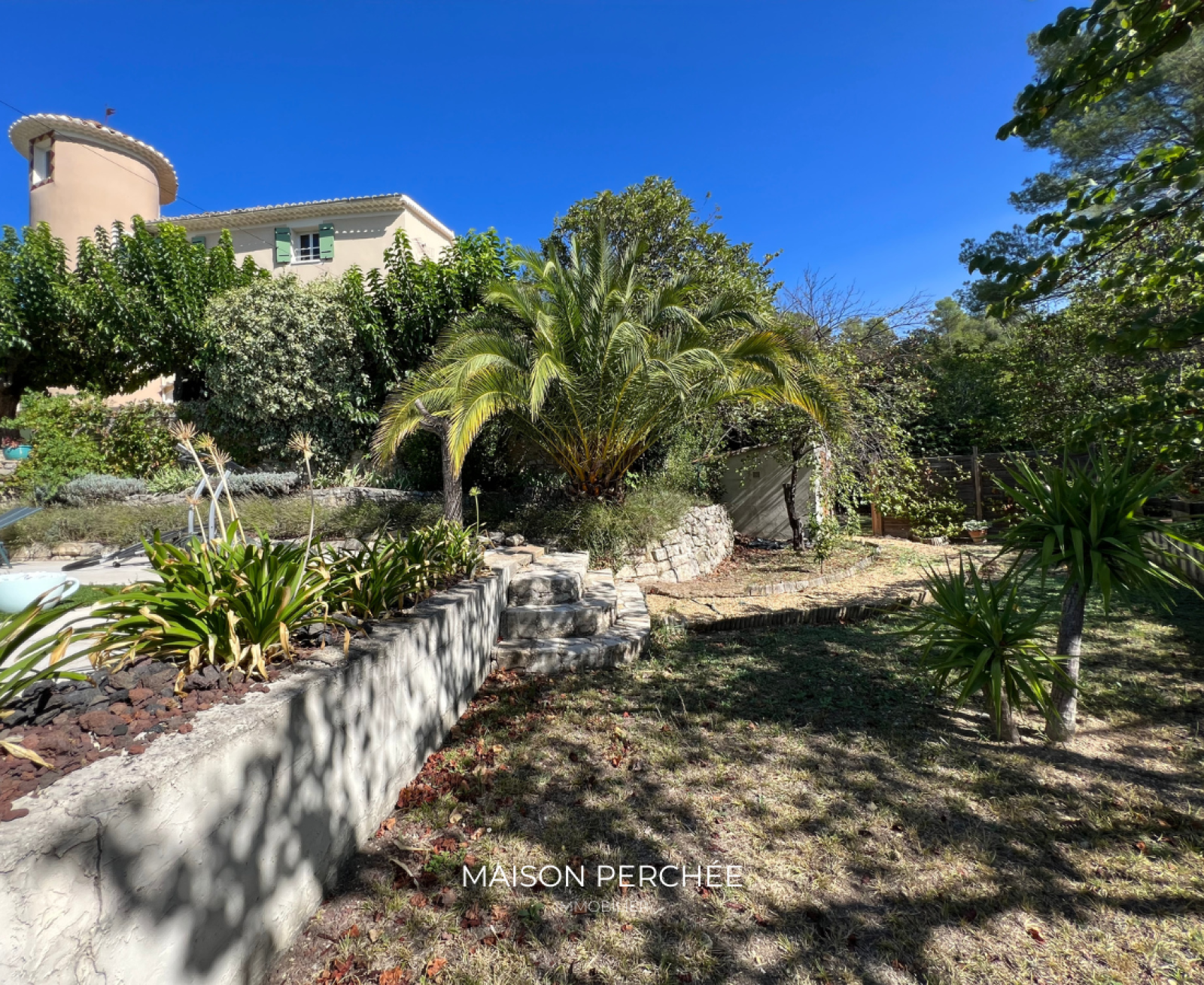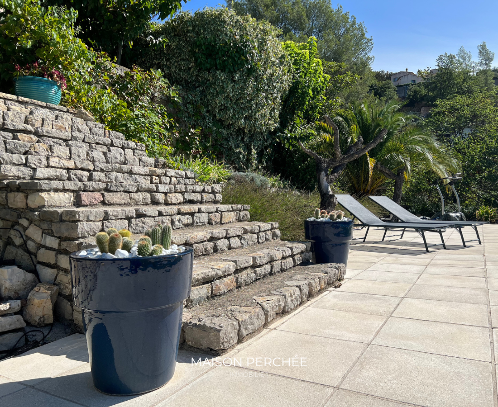 À l’extérieur, une vaste terrasse exposée Sud à ciel ouvert dispose également d’une partie ombragée par de vieux mûriers. En contrebas, un escalier dessert une piscine 10mx5m entourée d’une large terrasse ensoleillée à l’abri des regards. Un atelier fermé et un potager complètent l’ensemble.